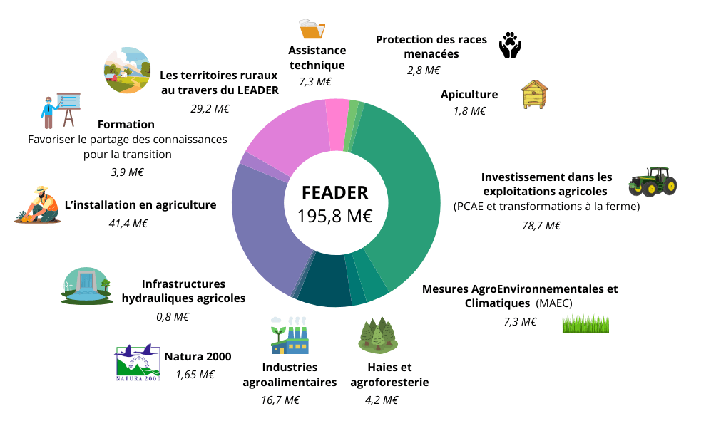 De 2014 à 2022, la région pays de la Loire disposait d’un montant de 694,5 millions d’euros au titre du Fonds européen agricole pour le développement rural (FEADER).Pour la programmation 2023-2027, la région dispose d’un montant de FEADER de 193,8 millions d’euros.